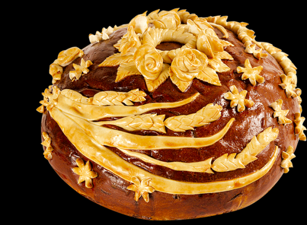 Технологія приготування: Тісто готується опарним способом. Для приготування опари – рідкого тіста – беруть 60% води або молока від загальної кількості, 40% борошна, 4% дріжджів і цукор для активаціїї дріжджів. У підігріту до 35-40 *С рідину додати розведені у теплій воді і процідженні дріжджі, цукор, всипати просіяне борошно і перемішати. Поверхню опари посипати борошном, діжу накрити кришкою і поставити у приміщення з температурою 35 – 40*С на 2, 5-3 години для бродіння. Коли опара збільшиться в об*ємі в 2-2, 5 раза і почне осідати, додати решту рідини з розчиненими сіллю і цукром, меланж або яйця. Потім все перемішати, всипати решту борошна і замісити тісто. Перед закінченням замішування додати розтоплений маргарин. Діжу закрити кришкою і залиши на 2 -3 години для бродіння. При цьому тісто обминають 2-3 рази. Для приготування прісного тіста потрібно вода, сіль і борошно. Сіль розчиняють у воді і додають борошно і замішують тісто. З готового дріжджового тіста формують коровай. Вверх короваю прикрашають виробами з прісного тіста. Перед випіканням коровай змастити меланжем. Випікати у розігрітій духовці при температурі 200- 220*С. Вимоги до якості: Коровай (мал.4.) правильної форми, без тріщин, надривів. Колір світло-коричневий. Тісто добре пропечене, еластичне, некрихке, рівномірно пористе, без пустот. Смак і запах приємні.
