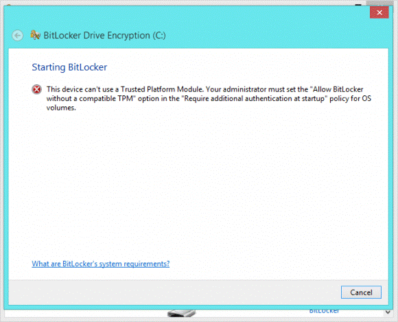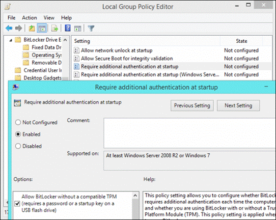 Рисунок 5.50 – Вікно сповіщення про бажане ввімкнення модуля TMP 4. Якщо у вас немає модуля TMP, для вимкнення вищеописаної опції нам потрібно відкрити команду строку завдяки комбінації клавіш «Win+R», та ввести там «gpedit.msc». 5. Потім потрібно перейти по наступним пунктам: Конфігурація комп'ютера (Computer Configuration)> Адміністративні шаблони (Administrative Templates)> Компоненти Windows (Windows Components)> Шифрування диска BitLocker (BitLocker Drive Encryption)> Диски операційної системи (Operating System Drives). 6. Подвійне натискання мишею на пункті «Вимагати додаткову перевірку автентичності при запуску комп'ютера» (Require additional authentication at startup), вибираємо опцію «Включити» (Enabled) і ставимо галочку в пункті «Дозволити використання BitLocker без сумісного TPM» (Allow BitLocker without a compatible TPM). Тисніть «Застосувати» для збереження налаштувань, зображено на рисунку 5.51.