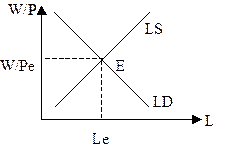 Пересечение кривых спроса и предложения труда дает точку Е (рис. 19). Этой точке на графике соответствует равновесный уровень реальной заработной платы W/Pe и заданное этим уровнем равновесное предложение труда Le. В точке E спрос на труд равен предложению труда, т. е. рынок труда, находится в равновесном состоянии. В точке Е предельный продукт труда, предельная выручка, получаемая от применения определенного количества труда, равна предельным издержкам или зарплате, выплачиваемой этим работникам: mrp = mc = w Это означает, что все предприниматели, согласные платить указанную заработную плату, находят на рынке необходимое количество труда.