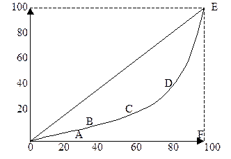 Абсолютное неравенство означает, что 20%, 40%, 60% и т. д. населения не получают никакого дохода, за исключением одного единственного, последнего в ряду (линия ОF) человека, который присваивает 100% всего дохода. Линия OF – это линия абсолютного неравенства. Реальное распределение дохода показано линией OABCDE. Чем больше отклоняется эта линия, или кривая Лоренца, от линии ОЕ, тем больше неравенство в распределении доходов. Если площадь участка графика, заключенного между линией абсолютного равенства и линией реального распределения дохода OABCDE, обозначить буквой Т, то можно получить следующее отношение: G = T/OEF,