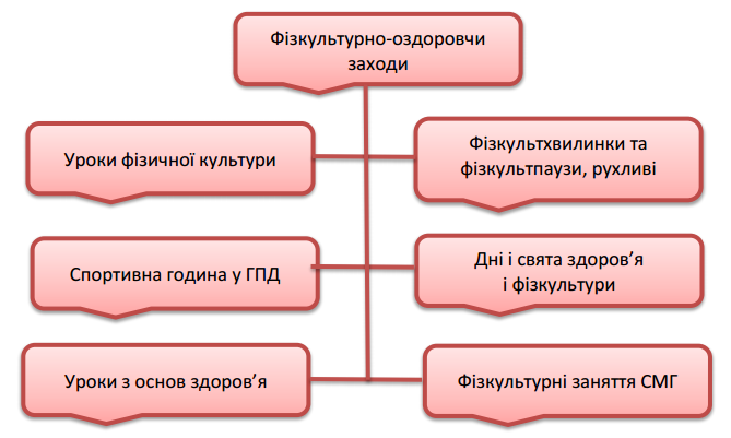 Позакласна спортивно-масова робота в загальноосвітній школі є одним з головних ланок фізичного виховання. Будують її на широкій основі самодіяльності учнів. Це організація й проведення фізкультурно-оздоровчих заходів, що включаються в режим дня школярів, спортивних змагань, туристичних походів, заняття в спортивних секціях, гуртках, забезпечення активної діяльності колективу фізичної культури школи. Пріоритетною формою набуття позитивної мотивації до занять фізичними вправами, збереження і зміцнення здоров’я школярів є система фізкультурно-оздоровчих і спортивно-масових заходів у школі: а) система фізкультурно-оздоровчих заходів в режимі навчального дня у школі: