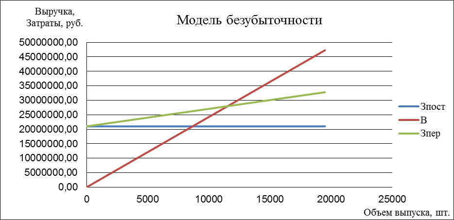 Себестоимость единицы продукции после проведения мероприятий по снижению себестоимости составляла 1 939, 60 руб., с наценкой 25% цена составит 2 424, 50 руб. Затраты постоянные (Зпост) = 21 005 833, 64; Затраты переменные (Зпер) = 11 797 076, 88; Зпост + Зпер = 32802910, 52; Выручка (В) = 47 277 788, 37; Выпуск (Q) = 19 500.