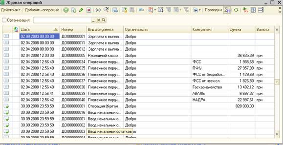 Каждая строка журнала является ссылкой на документ (ручная операция в данном случае рассматривается как документ особого вида). Табличная часть Журнала операций содержит несколько колонок: ● Пиктограмма – служебная колонка, в которой пиктограммой