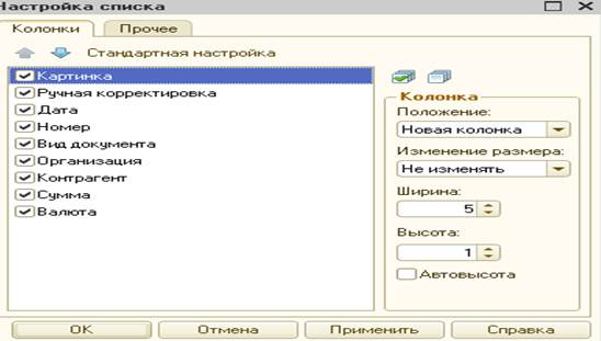 На закладке «Колонки» выполняется установка видимости и порядка колонок списка. ● Установите пометки тех колонок, которые требуется показывать в списке. ● С помощью кнопок «Переместить вверх» и «Переместить вниз» установите нужный порядок следования колонок в списке. ● Для настройки показа колонки укажите колонку и с помощью элементов управления, объединенных в группу «Колонка», выполните нужную настройку. ● В поле выбора «Положение» выбирается положение колонки. Выбор «Новая колонка» означает, что данные указанной колонки будут всегда располагаться с новой позиции. Выбор «На следующей строке» означает, что данные указанной колонки будут располагаться с новой строки под данными предыдущей колонки. Для первой колонки данный выбор не имеет смысла. Выбор «В той же колонке» означает, что данные указанной колонки будут располагаться в той же колонке, что и предыдущая колонка. Чтобы расположить группу колонок под колонкой или группой колонок необходимо для каждой следующей колонки в группе колонок, расположенных вверху, выбрать положение «В той же колонке», для первой колонки «второго этажа» выбрать положение «На следующей строке», а для всех последующих колонок выбрать «В той же колонке». ● В поле выбора «Изменение размера» устанавливается режим изменения размера колонки. Если выбрано «Изменять», то размер колонки можно изменять с помощью указателя мыши. Также размер колонки изменяется при изменении размера табличного поля. ● В поле ввода «Ширина» задается ширина колонки (в символах). ● В поле ввода «Высота» задается высота колонки (в строках). ● Если флажок «Автовысота» установлен, то высота будет вычисляться по представлению значения в колонке с учетом максимального числа строк, заданных в поле «Высота». ● Кнопка «Применить» позволяет сразу просмотреть результат выбранных настроек. ● Кнопка «Стандартная настройка» отменяет все пользовательские настройки и устанавливает настройки по умолчанию. ● Кнопка «ОК» закрывает диалог настройки списка и применяет выбранные настройки. ● Кнопка «Отмена» закрывает диалог настройки списка и отменяет выбранные настройки (даже если перед этим была нажата кнопка «Применить»). Важно знать, что если при конфигурировании или средствами языка для колонки запрещена ее настройка или изменение позиции (перетаскиванием или в диалоге), то настройка таких колонок невозможна. Также не допускается вставка колонок между двумя колонками, которым запрещено изменение положения. На закладке «Прочее» производится настройка восстановления позиции списка при его открытии, а также выбор позиции в списке при открытии, а также настройка автоматического обновления списка.