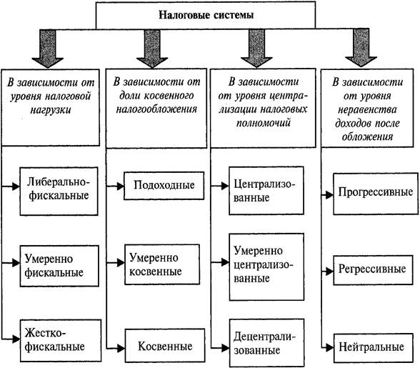 В зависимости от уровня налоговой нагрузки на экономику страны налоговые системы можно подразделить следующим образом: 1. Либерально-фискальные, обеспечивающие налоговые изъятия с учётом платежей социального характера до 30% ВВП; к этой группе относятся налоговые системы США, Австралии, Португалии, Японии; 2. Умеренно фискальные, с уровнем налогового бремени от 30 до 40% ВВП; данную группу составляют налоговые системы большинства стран, в частности Швейцарии, Германии, Испании, Греции, Великобритании, Канады и России. 3. Жёстко-фискальные, позволяющие перераспределять посредством налогов более 40% ВВП; к этой группе относятся налоговые системы Норвегии, Нидерландов, Франции, Дании, Швеции, Бельгии, Финляндии. В зависимости от доли косвенного налогообложения налоговые системы можно подразделить так: 1. Подоходные, делающие основной акцент на обложении доходов и имущества, в которых доля поступления от косвенных налогов не превышает 35% совокупных налоговых доходов; это налоговые системы США, Канады, Великобритании, Австралии; 2. Умеренно косвенные, равномерно распределяющие налоговую нагрузку на обложение доходов и потребления, в которых доля косвенных налогов составляет от 35 до 50% совокупных налоговых доходов; данную группу составляют налоговые системы развитых стран Европы- Германия, Франция, Италия; 3. Косвенные, делающие основной акцент на обложении потребления, в котором косвенные налоги обеспечивают более 50% совокупных налоговых доходов; такой уровень косвенного обложения обеспечивают, как правило, налоговые системы развивающихся стран – Аргентины, Бразилии, Мексики, Индии, Пакистана; к этой же группе относится и налоговая система России. В зависимости от уровня централизации налоговых полномочий налоговые системы классифицируются на: 1. Централизованные, наделяющие федеральный уровень управления подавляющим большинством налоговых полномочий и обеспечивающие долю налоговых доходов этого уровня более 65% консолидированных налоговых поступлений; такой уровень централизации обеспечивают налоговые системы Франции, Нидерландов, Австрии и Росси; 2. Умеренно централизованные, наделяющие все уровни управления значимыми налоговыми полномочиями и обеспечивающие долю налоговых доходов федерального уровня от 55 до 65% консолидированных налоговых поступлений; данную группу составляют налоговые системы Австралии, Германии, Индии. 3. Децентрализованные, наделяющие нижестоящие уровни правления более значимыми налоговыми полномочиями и обеспечивающие долю налоговых доходов федерального уровня до 55% консолидированных налоговых поступлений; к этой группе относятся налоговые системы США, Канады, Дании. В зависимости от уровня экономического неравенства доходов после их налогообложения налоговые системы можно разделить так: 1. Прогрессивные, если после уплаты налогов экономическое неравенство налогоплательщиков, оцениваемое по их доходам, сокращается; данную группу составляют налоговые системы практически всех развитых и развивающихся стран; 2. Регрессивные, если после уплаты налогов экономическое неравенство налогоплательщиков, оцениваемое по их доходам, возрастает; примеры построения таких налоговых систем практически неизвестны; 3. Нейтральные, если после уплаты налогов экономическое неравенство налогоплательщи