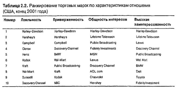 Впечатления о торговой марке · Успокаивающее воздействие. Потребление марки нежно успокаивает и умиротворяет потребителей. Они становятся сентиментальными и начинают симпатизировать марке. · Улучшение настроения. Потребление марки поднимает настроение потребителей, они начинают шутить, становятся беспечными, довольными, игривыми и т.д. · Возбуждение. Это разновидность бодрости. Торговая марка придает силы потребителям, они становятся энергичными и полагают, что столкнулись с чем- то особенным и первоклассным. Торговые марки, вызывающие возбуждение, иногда приводят к ощущению душевного подъема, бодрости, уверенности или сексуальности. · Безопасность. Потребляя марку, человек ощущает безопасность, комфорт, уверенность в себе. · Одобрение окружающих. Потребители охотнее пользуются маркой, если это нравится другим, когда другие одобряют их внешний вид, поведение и т.д. Часто брэнд символизирует принадлежность к определенной группе людей. · Самоуважение. Обладание престижными марками повышает самоуважение потребителей. Первые три вида впечатлений считаются поверхностными и появляются при использовании. Они не запоминаются, но повышают интенсивность взаимодействия потребителей с маркой. Последние три вида относятся к глубоко личным впечатлениям, они долго хранятся в памяти и укрепляют связь между потребителем и брэндом. Отношение потребителей к торговой марке и приверженность к торговой марке(как одно из высших его проявлений) Под приверженностью к торговой марке понимается характер контактов и сила привязанности потребителей к ней. Например, потребители активно контактируют с брэндами компаний Hariey-Davidson, Apple и eBay. Приверженность определяется · при анализе глубины психологической связи или · уровня активности приверженных потребителей. Выделяют четыре вида приверженности к марке. • Поведенческая лояльность. Поведенческая лояльность выражается в повторных покупках или стабильной доле марки в общем объеме покупаемых товаров данной категории, другими словами, сколько раз и в каких количествах потребители покупают брэнд Пожизненная стоимость верного потребителя General Motors составляет 276 тыс. долл. Считается, что за всю жизнь он купит 11 машин. Кроме того, его надо наградить, если он уговорит друзей и знакомых к покупке товаров GM. • Психологическая привязанность. Чтобы создать настоящую привязанность, нужно обеспечить сильную личную связь потребителя с маркой. Потребители должны считать марку чем-то большим, чем просто хороший товар. Например, наиболее приверженные потребители брэндов часто подчеркивают привязанность к ним, заявляя, что они обожают марку, считают самой лучшей или просто ищут что-то интересное и приятное. Исследования показали, что простой удовлетворенности порой недостаточно. Например, маркетологи фирмы Xerox разделили приверженцев марки на удовлетворенных и полностью удовлетворенных потребителей и доказали, что склонность первых к переходу на продукцию конкурентов в 6 раз выше. • Общность интересов. • Высокая заинтересованность. Кроме того, иногда торговые марки имеют более широкое социальное значение, объединяя потребителей в группы по интересам. Люди, интересующиеся маркой, постоянно контактируют друг с другом, бывшими пользователями, служащими и представителями компании. Во врезке “Кор