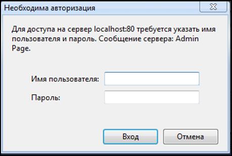 Рисунок 2.15. Окно авторизации Если пользователь ввел правильно имя пользователя и пароль (имя: admin, пароль: admin), то открывается главная страница админского блока, соответствии с рисунком 2.16, иначе поле имя пользователя и поле пароль автоматически очищаются, и пользователь может снова попытаться авторизоваться.