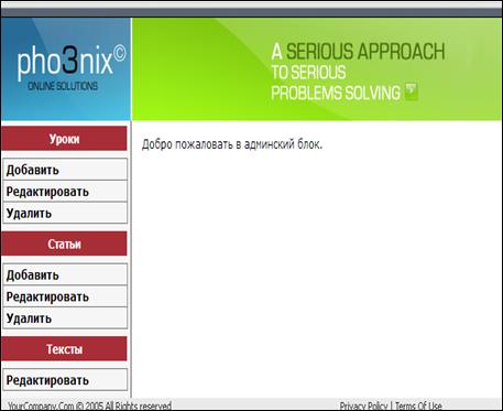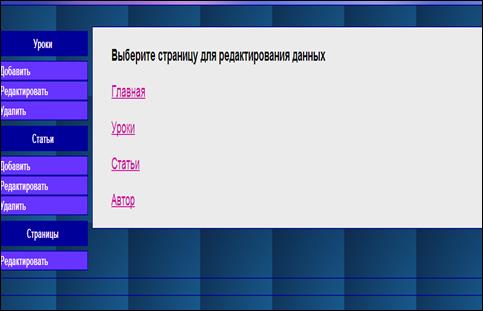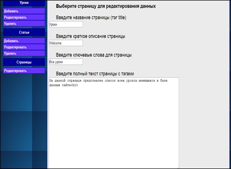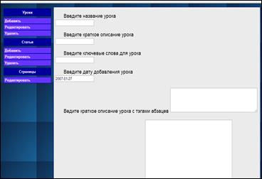 В админской части администратор может добавлять, редактировать удалять уроки, дидактический материал, нормативные документы, также редактировать главные страницы, гостевую книгу. При добавлении урока открывается окно в соответствии с рисунком 2.17.