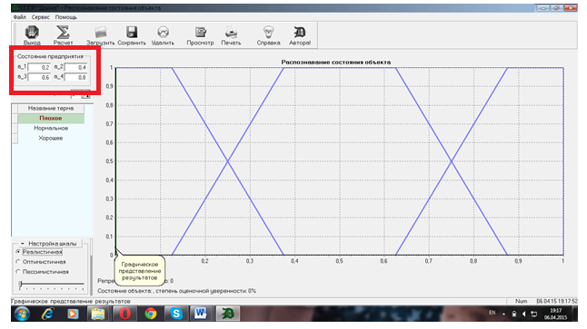 Система имеет следующие функциональные возможности: 1. настройка шкалы (реалистичная, пессимистичная, оптимистичная); 2. дефаззификация; 3. настройка графика (может быть представлен в объемном виде); 4. конструирование шкалы – создание и (или) выбор лингвистических характеристик для описания состояния объекта (меню Сервис); 5. задание числа термов (уровней качества объекта); 6. расчет результата оценивания (действительного репрезентативного числа), получение лингвистической оценки состояния объекта с указанием степени оценочной уверенности и построение графической интерпретации; 7. сохранение результатов расчета в виде отчета; 8. экспорт отчета в форматы.rtf,.pdf,.html, графика в формат.bmp; 9. печать результатов; 10. загрузка, просмотр, удаление ранее сохраненных отчетов; 11. редактирование шаблонов отчетов (меню Сервис); 12. управление панелью инструментов и базой данных (меню Сервис).