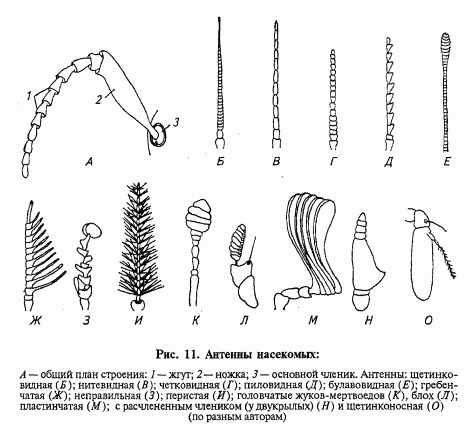 Обычно самая верхняя часть эпикраниума представлена теменем (Vertex), разделенным срединным эпикраниальным швом на правую и левую половины. Спускаясь на переднюю лицевую поверхность головы, эпикраниальный шов раздваивается налобные швы, ограничивающие треугольный лоб (frons). По обеим сторонам лба располагаются щеки (genae), переходящие без видимых границ в темя. Сзади они ограничиваются затылочным швом, служащим также задней границей темени. Позади затылочного шва за щеками имеются узкие защеки (postgenae), а за теменем — поле затылка (occiput). В свою очередь, и затылок, и защеки отделены заднезатылочным, или постмаксиллярным, швом от заднезатылка (postocciput), окаймляющего узким воротничком затылочное отверстие. На лицевой поверхности и с боков головной капсулы нижней границей лба, щек и защек является шов, именуемый подо лбом эпистомальным швом, под щеками субгенальным и под защеками гипостомальным швом. Он отделяет ото лба широкий наличник (clypeus), с которым сочленена верхняя губа (labrum), а от щек и защек узкие подщеки (subgenae) с верхними (mandibulae) и нижними (maxillae) челюстями насекомого. Непосредственно под заднезатылком причленяется нижняя губа (labium). На лбу и темени многих насекомых находятся 1–3 маленьких дорзальных, или теменных, глазка, а у концов эпистомального и постмаксиштярного швов, то есть между лбом и наличником и над основаниями нижних челюстей, — глубокие тенториальные ямки. Эти ямки образованы втачиваниями покровов, которые проникают узкими рукавами внутрь головной капсулы и формируют ее внутренний скелет — тенторий (tentorium), показанный на рисунке 7. И тенторий, и швы эпикраниума придают голове насекомых особую прочность и служат опорой для мощных челюстных мышц и мышц глотки. Этим же целям отвечают общая консолидация и слияние головных сегментов друг с другом, не допускающие взаимных смещений и деформаций. Антенны насекомых представляют собой парные членистые придатки, обычно весьма подвижные и хорошо развитые. Лишь у личинок мух и некоторых перепончатокрылых, а также у самок веерокрылых и бабочек-мешочниц антенны редуцированы до небольших бугорков или дисков. Выполняя роль своеобразных локаторов, они могут считаться по совокупности отдельных рецепторов органами осязания и обоняния, а иногда и органами слуха, воспринимающими ультразвук. Полагают, что они соответствуют первой паре анггенн ракообразных. Положение антенн, как и их размеры и форма, весьма изменчиво у разных видов. Обычно антенны располагаются в неглубокой антеннальной ямке на темени, вблизи глаз или верхних челюстей насекомого и состоят (рис. 11) из основного членика (scapus), членика-ножки (pedicellum) и многочленикового жгута (flagellum).