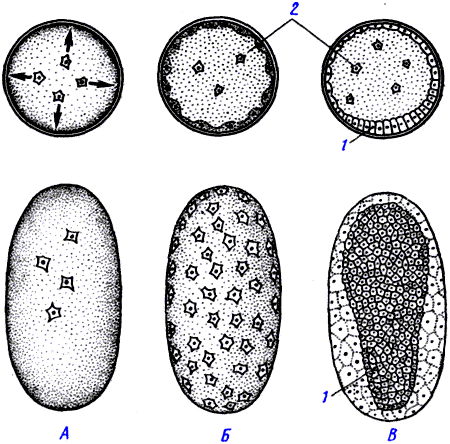 Дробление и образование зародышевой полоски у насекомых. А - начало дробления; Б - начало образования бластодермы; В - формирование зародышевой полоски: верхний ряд - поперечные разрезы через зародыши; нижний ряд - вид зародыша с брюшной стороны (из Иоффа): 1 - зародышевая полоска, 2 - желточные клетки