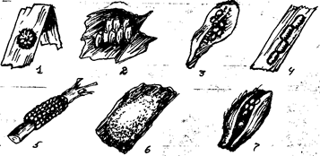 Рис. 9. Типы кладок яиц насекомых: 1-озимая совка, 2-капустная белянка, 3-луговой мотылек, 4-хлебная пьявица, 5-кольчатый шелкопряд, 6-непарный шелкопряд, 7-зерновая совка.