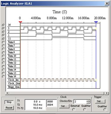 Анализатор снабжен двумя визирными линейками для точных отсчетов временных интервалах Т 1, Т 2 и Т 2 – Т 1 (окно в поле Т 1, Т 2, Т 2- Т 1), а также линейкой прокрутки по горизонтали для просмотра осциллограмм на большом временном интервале. На панели Clock в строке Clocks/Div задается длительность развертки. В этом блоке имеются клеммы для подключения как обычного (Extend), так и избирательного (Qualifier) источника запускающих сигналов, параметры которых устанавливаются с помощью меню, вызываемого кнопкой Set. В окне Trigger можно задать логические сигналы 1, 0 и Х, при наличии которых производится запуск анализатора. Кнопки Stop и Reset предназначены для остановки и перезапуска режима моделирования.