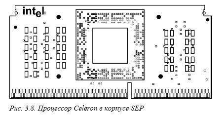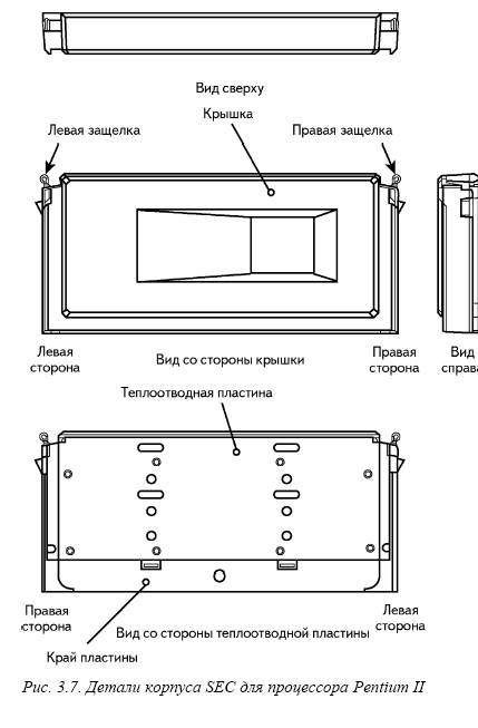 Процессор Pentium III упаковывается в корпус, который называется SECC2 (Single Edge Contact Cartridge, версия 2) и является разновидностью корпуса SEC. Крышка расположена с одной стороны, а с другой стороны непосредственно к микросхеме прикрепляется охлаждающий элемент. Такое конструктивное решение позволяет более эффективно отводить от процессора тепло. Процессоры в этом корпусе вставляются в разъемы Slot 1. Корпус SECC2 показан на рис. 5 Основная причина перехода к использованию корпусов SEC и SEP состояла в том, чтобы при минимуме затрат переместить кэш-память второго уровня с системной платы на одну плату с процессором. Используя корпуса SEC и SEP, Intel может легко варьировать объем и быстродействие кэш-памяти, поставляемой в одной упаковке с процессором Pentium II/III.