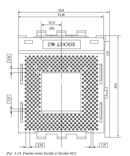 Socket A (Socket 462) содержит 462 контакта и имеет те же размеры, что и Socket 370. Однако поместить процессор для гнезда Socket 370 в Socket A невозможно. Это гнездо поддерживает 32 значения напряжения питания в диапазоне 1, 100–1, 850 В с шагом 0, 025 В (контакты процессора VID0–VID4). Блок регулирования напряжения питания встроен в системную плату. Внешний вид гнезда Socket A (Socket 462) показан на рис. 10. Существует в общей сложности 11 “заглушенных” отверстий, в число которых вошли и два внешних микроотверстия. Эти отверстия используются для правильной ориентации процессора в гнезде во время его установки. Схема расположения выводов Socket A показана на рис. 11. Компания AMD объявила о том, что все новые версии процессоров Athlon и Duron будут выпускаться только для гнезда Socket A.