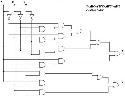 Логическое выражение для C также будет иметь четыре слагаемых (строки 6, 8, 9, 10): Ci=A ′ BCi- 1 +A ′ BCi- 1′ +ABCi- 1′ +ABCi- 1. С помощью законов булевой алгебры (см. лаб. раб. №1) это выражение можно упростить, тогда оно будет иметь вид Сi=ACi- 1 +BCi- 1 +AB. Схема полного сумматора изображена на рис. 49.