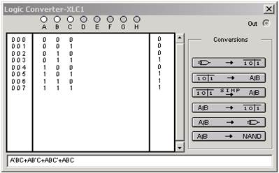 Логический преобразователь (Logic Converter) На лицевой панели преобразователя (рис. 54) расположены клеммы-индикаторы входов A, B, C, …, H и клемма выхода Out, окно для отображения таблицы истинности исследуемой схемы, строка для отображения ее булева выражения и панель Conversions. На панели Conversions расположены шесть кнопок, используемых для получения: · · ·