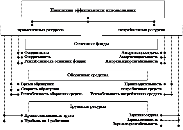 Затратный подходпостроения показателей эффективности нацелен на характеристику эффекта деятельности предприятия, получаемого с каждой единицы совокупных затрат или отдельно затрат живого или овеществленного труда. В общем виде показатель эффективности потребленных ресурсов рассчитывается как отношение реализованных товаров или прибыли от реализации товаров к стоимости затрат. На предприятиях торговли показателем реализованных товаров является товарооборот в ценах реализации. Затраты в торговом предприятии рассматриваются как издержки обращения. Ресурсный подход призван характеризовать эффективность использования всех видов ресурсов, которыми располагает предприятие торговли, или использования отдельных видов ресурсов: трудовых, материальных, финансовых. Он отражает результат деятельности предприятия на единицу имеющихся ресурсов. [26.c.76] В общем виде показатель эффективности авансированных (примененных) ресурсов рассчитывается как отношение стоимости реализованных товаров, или прибыли от реализации товаров, к совокупной стоимости авансированных ресурсов. В качестве авансированных ресурсов выступает показатель валюты баланса, представляющий собой всю сумму хозяйственных средств, используемых в обороте предприятия. Применение одного из подходов к оценке эффективности деятельности предприятия носит ограниченный характер, так как все ресурсы, используемые предприятием в ходе его деятельности, необходимо подразделять на примененные (ресурсы) и потребленные (затраты). Исходя из вышеизложенного, система показателей эффективности деятельности предприятия обобщена автором в виде схемы, представленной на рис. 1.1.3