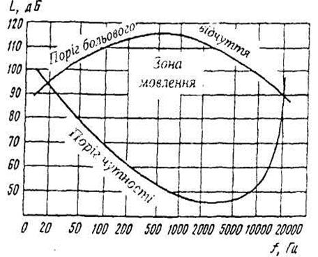 Рис. 5.1. Зона слухового сприйняття людини Звукова хвиля характеризується: · частотою коливань – кількість повних коливань за одиницю часу, f, Гц; · інтенсивністю (силою звуку) – кількість енергії, що проходить за 1 с через площу 1 м2 поверхні, перпендикулярної до напрямку поширення звукової хвилі, I, Вт/м2; · звуковим тиском – абсолютна різниця між тиском максимального згущення повітря та атмосферним тиском, Р, Па. Мінімальна інтенсивність І0 та звуковий тиск Р0, які сприймаються вухом людини, називаються порогом слухового відчуття. Порогові значення І0 та P0 пов’язані з частотою коливань звуку. При частоті 1000 Гц звуковий тиск Р0 = 2 105 Па, I0=1012 Вт/м2. При звуковому тиску 2·102 та інтенсивності звуку 10 Вт/м2 і з частотою 16...20000 Гц виникають больові відчуття (больовий поріг). Коливання частотою понад 20 000 Гц називають ультразвуком, а нижче 16 Гц – інфразвуком. Оскільки різниця між больовим порогом та порогом слухового сприйняття дуже велика, то, щоб не оперувати великими числами, вчений А. Г. Белл запропонував вимірювати не абсолютні значення інтенсивності звуку чи звукового тиску, а їх логарифмічні рівні L, взяті за відношення до порогового значення Р0 чи І0,