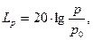 де р – середньоквадратичне значення звукового тиску в даній точці, Па; р0 – порогове значення звукового тиску. Рівень звукового тиску Lp та рівень інтенсивності звуку вимірюється в децибелах (дБ) та LI = Lp. Це пов’язано з тим, що