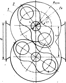 Принцип дії лічильника заклечається в обкочуванні двох роторів спеціальної форми(нагадуючи цифру «всім»), один по одному під дією потоку газу. Синхронність обкочування забезпечується спеціальними зубчатими колесами з’єднаними з відповідними роторами і між собою. Для забезпечення точності вимірювання профіль роторів і внутрішня поверхня корпуса лічильника повинні бути виконані з високою точністю, що досягається використанням спеціальних технологічних прийомів обробки цих поверхонь. Ротори газових лічильників (рис.1.3) є різновидом коліс Рута. Ротори приводяться в обертання внаслідок різниці тисків у камері з боку входу і виходу газу. У положенні роторів, зображеному на рис.1.3, рівнодіюча надлишкових тисків Rn1 проходить поза центром обертання ротора 1, і цей ротор є провідним; рівнодіюча Rn2 проходить приблизно через О2, і ротор 2 є веденим. У процесі обертання ротори займуть таке становище, коли вони обидва опиняться ведучими, а після повороту на 90 ° ведучим стане ротор 2, веденим - ротор 1. Обертання від ведучого ротора до веденого, так само як і в повітродувках, передається за допомогою пари зубчастих коліс з передавальним відношенням, рівним одиниці. Поверхні роторів у процесі передачі обертання безпосереднього контакту не мають, і між ними повинен бути утворений зазор постійної величини. Це досягається установкою на обох кінцях роторів по парі зубчастих коліс, відповідним чином зафіксованих на валах роторів. За повний оберт обох роторів газом заповнюються чотири об’єми, один з яких заштрихований на малюнку. Знаючи величину такого об’єму, за числом обертів ротора можна визначити об’єм пропущеного газу.