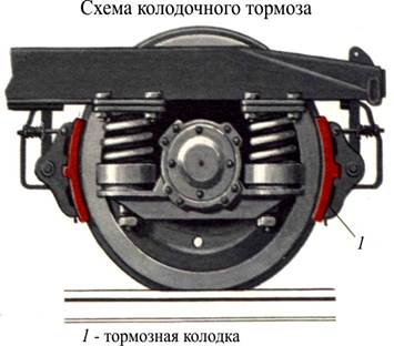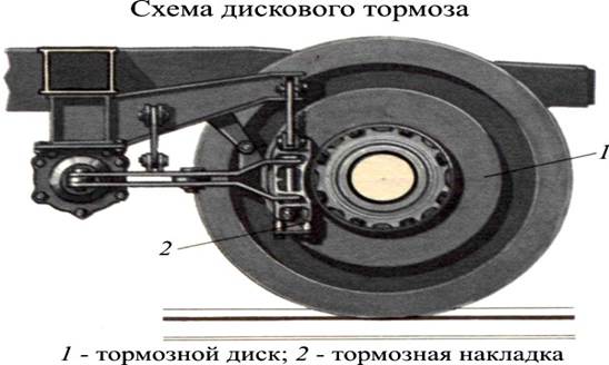 Стояночные, пневматические и электропневматические тормоза относятся к разряду фрикционных тормозов, у которых сила трения создается непосредственно на поверхности колеса (рис.2.1), либо на специальных дисках, жестко связанных с колесными парами (рис.2.2).