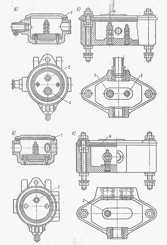 Через штуцер 3 в головку введен двухжильный шланговый провод 4, подсоединяющийся к подвижному контактному пальцу и контактному кольцу. Провод обвивается вокруг рукава и закрепляется с одной стороны резиновым кольцом 2, а с другой - металлическим хомутом 5. Провод 1, припаянный к контактному пальцу, на свободном конце имеет наконечник с отверстием под болт М8, а провод № 2, припаян к контактному кольцу, - наконечник под болт Мб. Разница диаметров отверстий в наконечниках исключает неправильный монтаж. При несоединенных головках контактный палец 7 пружиной 12 сжимается нижним (по рисунку) буртиком к контактному кольцу 9 замыкает электрическую цепь рабочего и контрольного проводов. При соединении головок двух рукавов подвижные пальцы, соприкасаясь сферическими контактными частями, отжимаются от контактных колец и обеспечивают соединение линии рабочего провода № 1 между вагонами, а контрольный провод № 2 соединяется через гребни и корпуса головок (заклепка 1 на гребне служит для улучшения контакта). Головка рукава № 369А в подвешенном состоянии должна быть изолирована от корпуса вагона (локомотива). С этой целью применяют подвески с изоляционной вставкой из резины или пластмассы. На локомотивных подвесках имеется поворотная ручка 4 с изоляционными накладками 5, б для отжатия подвижного пальца, чтобы соединение рабочего и контрольного проводов проис-ходило только на хвостовом вагоне поезда. Клеммные коробки. В электрических цепях ЭПТ применяются коробки двух типов: двухтрубные с чугунным №316-000 (рис.78, а) или с пластмассовым № 316-000-7 (рис.78, б) корпусом, располагаемые по концам вагона или локомотива в месте соединения линейных проводов с рукавом № 369А, и трехтрубные № 317-000 и 317-000-7 (рис.78 в, г), размещаемые в средней части вагона в месте соединения рабочего провода с отводом к электровоздухораспределителю. Двухтрубные коробки имеют два, а трехтрубные три резьбовых отверстия для соединения с кондуитными трубами. В двухтрубной коробке (см. рис.78а, б) закреплены болт 2 с резьбой Мб иболт 3 с резьбой М8 для подсоединения линейных проводов и их подключения к головкам рукавов. В трехтрубной коробке (см. рис.78 в, г) имеется один болт 3, на котором закрепляются наконечники рабочего провода и отвода к электровоздухораспределителю; контрольный провод проходит через такую коробку транзитно, без электрических соединений. Чугунные коробки закрываются откидными крышками 1, а пластмассовые - съемными 4. Особенности эксплуатации ЭПТ. Надежность действия ЭПТ в значительной степени зависит от правильности монтажа и содержания цепи управления и исправности локомотивного оборудования. На всех вагонах и локомотиве рабочий провод должен быть подключен к подвижному латунному контакту рукава № 369А, так как в случае протекания рабочего тока через контакт на гребне головки происходит значительное падение напряжения, которое может нарушить нормальное действие ЭПТ. Правильность монтажа обеспечивается различным диаметром зажимных болтов, к которым подсоединяются рабочий и контрольный провода (соответственно 8 и 6 мм).