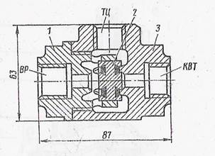 Переключательный клапан № ЗПК. (рис.121) автоматически сообщает тормозной цилиндр локомотива с воздухораспределителем или краном вспомогательного тормоза, которым производится торможение. Состоит он из корпуса 3, крышки и клапана 2 с двумя резиновыми уплотнениями. Корпус имеет два отростка с резьбой 3/411 для подсоединения к тормозному цилиндру ТЦ и крану вспомогательного тормоза КВТ, а в крышке - отверстие ВР с резьбой 1/2" для подключения воздухопровода от воздухораспределителя. Под действием давления сжатого воздуха клапан перебрасывается до упора в седло в корпусе или крышке и открывает каналы сообщения тормозного цилиндра с воздухораспределителем или краном вспомогательного тормоза. Клапан максимального давления № ЗМД (рис.122а) ограничивает давление сжатого воздуха. Корпус 3, в котором располагается нагруженный пружиной клапан 4, соединен резьбой со стаканом 6. В стакан вставлен подпружиненный поршень 5, уплотненный манжетой. Усилие пружины 7 регулируется гайкой 5 с предохранительным колпачком 9. Сжатый воздух поступает от главного резервуара через отросток 2, и открытый клапан 4 в отросток 1 (к тормозному цилиндру ТЦ) и полость над поршнем 5. После повышения давления до значения, достаточного для сжатия пружины 7, клапан 4 опускается на седло и перекрывает поступление сжатого воздуха в цилиндр.
