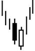 Первая свеча черная, вторая открывается значительно ниже минимума предыдущей свечи. Те же признаки что и у завесы из темных облаков, но если в завесе могут быть исключения (второе тело не всегда закрывает более половины первого), то у просвета исключений нет! Тело второй свечи должно закрыть более половины тела первой. Причина в том, что есть три модели продолжения медвежьей тенденции, когда вторая бычья свеча закрывает тело первой менее чем наполовину: