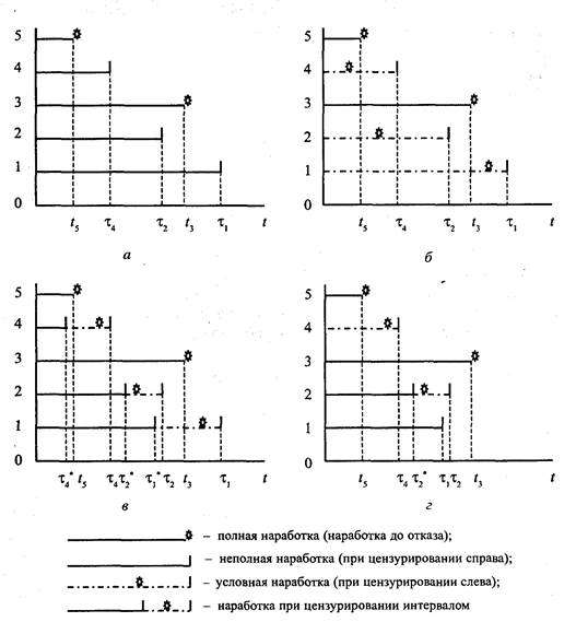 Рис. 6.1. Распределение значений наработок объектов для цензурированной выборки: а - справа; б - слева; в - интервалом; г – комбинированного Необходимо обратить внимание на то, что цензурирование интервалом является наиболее общим видом цензурирования, так как при устремлении правой границы интервала к бесконечности этот вид цензурирования превращается в цензурирование справа, а при устремлении левой границы интервала к нулю - в цензурирование слева. При устремлении границ интервала друг к другу цензурирование исчезает. Рассмотрим понятие «наработка». Полная наработка - это наработка изделия до отказа. Неполная наработка - наработка объекта от начала испытаний или эксплуатации до прекращения испытаний или эксплуатационных наблюдений до отказа. Условная наработка при цензурировании слева - это значение интервала, измеряемого в единицах наработки, в пределах которого произошел отказ. Эта наработка названа условной потому, что объект может не работать в пределах всего интервала, так как отказ может наступить в некоторой части этого интервала. Наработка при цензурировании интервалом складывается из неполной наработки и условной наработки при цензурировании слева. Причины появления цензурированных данных Отметим причины появления цензурированных данных на примере обработки результатов наблюдений с целью определения характеристик надежности объектов. Причиной появления цензурированных данных в данном случае является специфика организации функционирования объектов, состоящая в том, что реально функционирующие объекты в процессе работы до отказа стараются не доводить. На предприятии регулярно проводятся планово-профилактические работы (ППР), цель которых состоит в восстановлении работоспособности объектов. В большинстве случаев схема функционирования элементов следующая: в период проведения ППР объекты выводят из работы и на их место ставят новые. Работоспособность снятых объектов восстанавливается до первоначального уровня; если есть необходимость, производят их ремонт, настройку, чистку и прочие мероприятия. При проведении следующих ППР эти устройства ставятся в систему, а объекты, которые находились в работе, выводят для проведения восстановительных мероприятий. Особенностью функционирования является также наличие контроля исправности работы элементов, их замена при достижении определенной наработки, независимо от того, отказал элемент к данному моменту или нет. Рассмотрим более детально причины возникновения цензурированных данных. 1. Разное время установки в систему и снятие с эксплуатации однотипных объектов. Такая схема организации эксплуатации характерна для элементов, которые выводятся из работы в период проведения ППР независимо от того, отказали они или нет; на их место устанавливаются аналогичные объекты из состава запасных изделий. Указанный режим организации эксплуатации имеет место для большинства объектов системы управления и защиты (СУЗ) энергоблоков АЭС, для ряда контрольно-измерительных приборов и устройств автоматики. Другой причиной может служить наличие резервных каналов и технологических петель, которые временно выводятся из работы и включаются в случае обнаружения отказа на работающем оборудовании. 2. Снятие объектов с эксплуатации из-за отказов составных частей, на