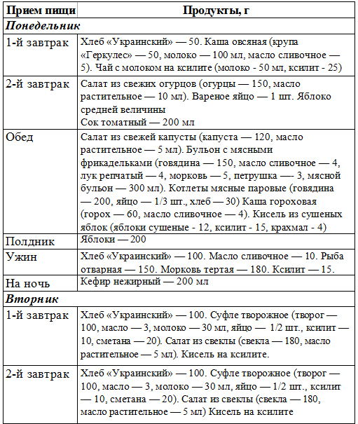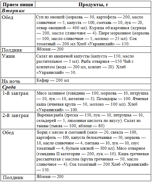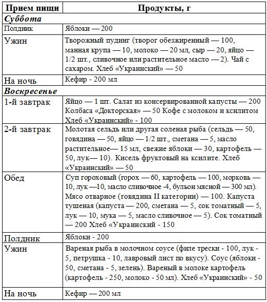 Общее количество калорий в диете из таблицы составляет 2165, 8 ккал. Если при такой стандартной диете происходит некоторое понижение уровня сахара в крови и моче (или даже сахар исчезает полностью в моче), то через пару недель рацион можно расширить, но только по разрешению врача! Врач проконтролирует уровень сахара в крови, который не должен быть выше 8, 9 ммоль/л