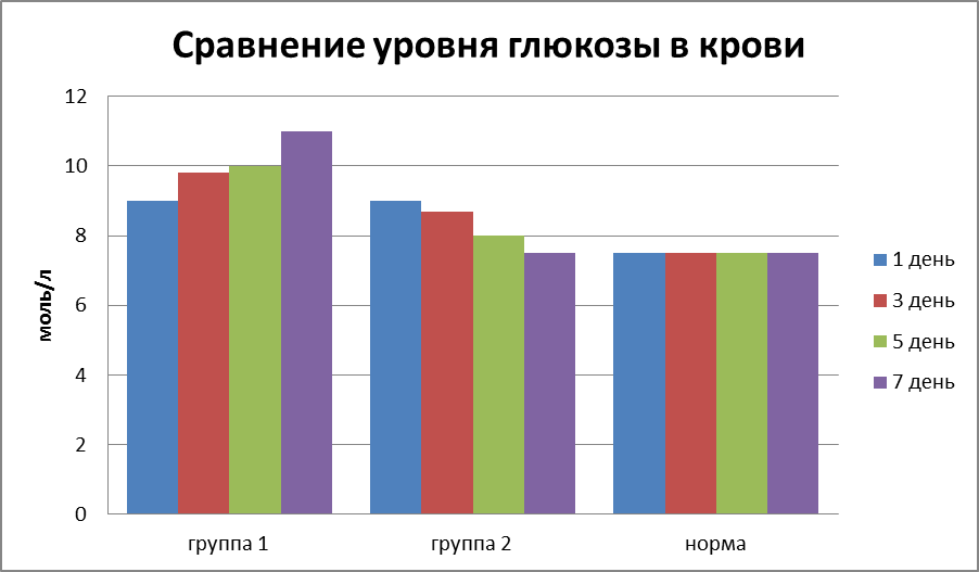 По данным таблиц и диаграмм можно сделать такие выводы: 1. Уровень общего холестерина в первой группе повышался на ±0, 3 моль/л, во второй группе снизился на ±0, 8 моль/л 2. Уровень глюкозы в крови в первой группе повысился на ±2, 0 моль/л, во второй группе отмечалось понижение уровня на±1, 5 моль/л 3. Уровень систолического давления в первой группе повысился на ±6 мм РТ ст, во второй группе понизилось на ±8мм РТ ст 4. ЧСС в первой учащалось на 14 уд/мин, во второй группе ЧСС видимо понизилось на 7 уд/мин. 5. Вес в первой группе увеличился на 400-600 гр., во второй группе снизился на ±1200 гр.