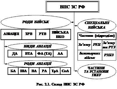 Наприкінці 2009 р. у ВПС, як виду ЗС РФ, закінчено реформування їх складу та організаційної структури. Військово-Повітряні Сили ЗС РФ мають такий склад (рис.2.1): роди військ – авіація, ЗРВ, РТВ, Війська повітряно-космічної оборони (ПКО); спеціальні війська – частини (підрозділи) зв’язку, РЕБ, зв’язку та РТЗ, інженерних військ і РХБЗ; частини та установи тилу.