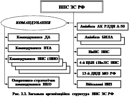 До авіації ВПС ЗС РФ входять види авіації (ДА, ВТА, ФА (ТА), АА) та роди авіації (БА, ША, ВА, РА, ТрА, спеціальна авіація (СпА). Здійснено перехід до нової загальноїорганізаційної структури ВПС ЗС РФ, яка має такі формування (заклади, установи) (рис.2.2): командування ДА; командування ВТА; чотири командування ВПС і ППО; оперативно-стратегічне командування ПКО; авіабаза бойового застосування авіаційного комплексу (АК) РЛДН А-50; дві авіабази БПЛА; повітроплавна служба (ПвПС) ВПС; 4-й центр бойового застосування і перенавчання льотного складу (ЦБП і ПнЛС) ВПС; 13-й державний науково-дослідний інститут (ДНДІ) МО РФ; військові ВНЗ.
