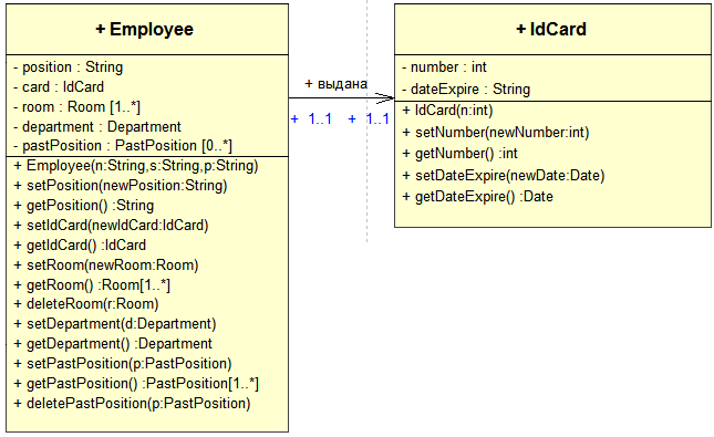 Классы: public class Employee extends Man{ private String position; private IdCard iCard; public Employee(String n, String s, String p){ name = n; surname = s; position = p; } public void setPosition(String newPosition){ position = newPosition; } public String getPosition(){ return position; } public void setIdCard(IdCard c){ iCard = c; } public IdCard getIdCard(){ return iCard; }}public class IdCard{ private Date dateExpire; private int number; public IdCard(int n){ number = n; } public void setNumber(int newNumber){ number = newNumber; } public int getNumber(){ return number; } public void setDateExpire(Date newDateExpire){ dateExpire = newDateExpire; } public Date getDateExpire(){ return dateExpire; }}