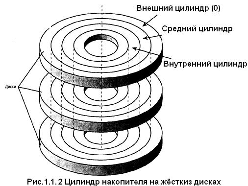 В накопителях обычно устанавливается несколько дисков, и данные записываются на обеих сторонах каждого из них. В большинстве накопителей есть по меньшей мере два или три диска (что позволяет выполнять запись на четырех или шести сторонах), но существуют также устройства, содержащие до 11 и более дисков. Однотипные (одинаково расположенные) дорожки на всех сторонах дисков объединяются в цилиндр (рис. 1.1.2).