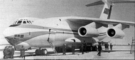 Проектирование транспортного самолета с предъявляемыми к нему разнообразными требованиями, диктуемыми универсальностью применения самолета, является технически трудной задачей. Для самолета Ил-76 эта задача еще более усложнялась требованиями по обеспечению эксплуатации самолета на грунтовых аэродромах ограниченных размеров и получения в этих условиях сравнительно коротких для такого класса самолетов длин разбега и пробега. Поэтому необходимо было изыскивать новые технические решения и проводить дополнительные исследования. В частности потребовалось создать специальное многоколесное шасси повышенной проходимости. Сравнительно короткий разбег и пробега обеспечивались следующими конструктивными решениями: – аэродинамической компоновкой крыла умеренной стреловидности с высокоэффективной механизацией: – повышенной тяговооруженностью за счет установки на самолет четырех двигателей с взлетной тягой по 11 760 даН (12 ООО кге), снабженных реверсивными устройствами тяги для торможения самолета при пробеге; – высокоэффективной тормозной системой колес основных опор самолета. Эти особенности выгодно отличают самолет Ил-76 от существующих транспортных самолетов как в СССР, так и за рубежом. Кроме того, при разработке самолета большое внимание было уделено обеспечению безопасности полета, надежности и автономности эксплуатации. В процессе создания самолета на его конструкцию и системы было получено более двухсот авторских свидетельств на изобретения и более тридцати иностранных патентов. Постройка первого опытного самолета проводилась в Москве на опытном производстве предприятия с участием многих предприятий страны, которые поставляли материалы, необходимые для постройки самолета, агрегаты и системы. Возглавляли постройку самолета директор предприятия Д. Е. Коф- ман и главный инженер В. А. Юдин. Постройка первого опытного самолета была завершена в начале 1971 года. Самолет выкатили на Центральный аэродром города Москвы. Как известно, знаменитая Ходынка расположена всего в шести километрах от Кремля, но первый полет предстояло выполнить именно отсюда. Аэродромные отработки самолета проводили коллективы цеха общей сборки под руководством В. М. Орлова, лабораторно-стендового комплекса под руководством В. П. Боброва и бригады самолета под руководством старшего наземного механика В. В. Лебедева. Общее руководство работами по подготовке к первому вылету самолета было возложено на ведущего инженера по летным испытаниям самолета М. М. Киселева. 25 марта 1971 года экипаж во главе с Заслуженным летчиком-испытателем Э. И. Кузнецовым выполнил перный полет на первом опытном самолете Ил-76, совершив посадку на аэродроме Раменское. Сразу же после перелета самолета на летную базу предприятия начался заводской этап летных испытаний по разделу определения летно-техничес- ких и взлетно-посадочных характеристик самолета. В мае того же года самолет был продемонстрирован руководителям страны, на подмосковном аэродроме Внуково, а затем впервые был представлен на XXIX международном авиационно-космическом салоне в Париже. Практически через два года с того же Центрального аэродрома был поднят второй опытный самолет Ил-76. Первый полет на этом самолете выполнил экипаж во главе с летчиком-испытателем Г.Н. Волоховмм. Ведущим инженером п