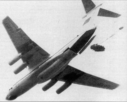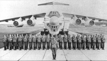 21 апреля 1076 года вышло Постановление Правительства СССР о принятии на вооружение военно-транспор- тной авиации военно-транспортного самолета Ил-76 с четырьмя турбовентиляторными двигателями Д-30КП. Первые модификации самолета Ил- 76 имели взлетную массу 170 т, грузоподъемность 28 т и дальность полета с максимальной нагрузкой 4 200 км. В ходе модернизации взлетная масса возросла до 190 т, грузоподъемность до 43 т, а дальность с этой нагрузкой достигла 4 000 км. В грузовой кабине могут разместиться 145 или 225 (модификации -М, -МД в двухпалубном варианте) солдат или 126 десантников (в первоначальном варианте их было 115). В грузовой кабине могут разместиться три боевые машины десанта БМД-1, которые могут быть перевезены в варианте посадочного десантирования, так и в варианте парашютного десантирования в платформенном или бесплатформенном виде. Самолет может десантировать четыре груза массой по 10 т или два моногруза массой по 21 т. Существенно, по сравнению с турбовинтовыми самолетами, расширился диапазон скоростей полета – с 260 до 825 км/ч. Это позволило сократить сроки выполнения задач, поднять возможности преодоления ПВО противника, а также улучшить условия десантирования личного состава и боевой техники. Наряду с основными летно-техническими характеристиками новой авиационной техники существенно возросли качество и возможности радиосвязного. навигационного, пилотажного, десантно-транспортного оборудования и вооружения самолета. ПНПК-76 позволил осуществить автоматический полет по маршруту, выход в точку десантирования. прицеливание, десантирование и заход на посадку в автоматическом или деректорном режиме. Оборудование самолета позволило полностью автоматизировать полет в боевых порядках.