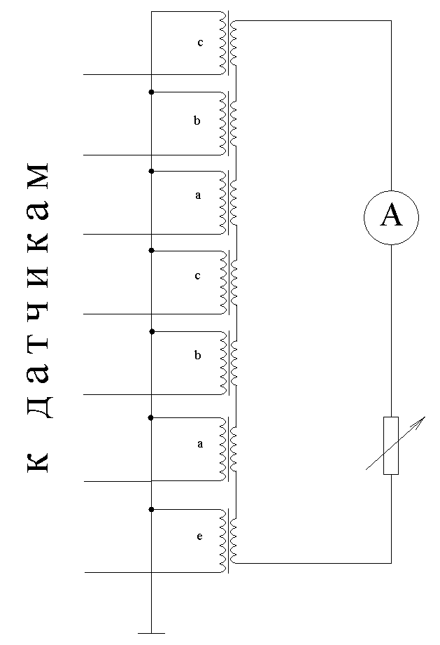 То есть, степень влияния на центровку самолета определяется умножением массы топлива в баке и плеча результирующей силы распределенных сил тяжести топлива по всему баку. Это умножение на «языке» прибора можем устроить в виде увеличения напряжения в c, b, a, e раз, с помощью обычных трансформаторов. А сумма степеней влияния баков на центровку самолета осуществляется суммированием напряжений, путем последовательного соединения. Если, каким то образом при определений степеней влияния баков на центровку самолета, окажется что какой либо бак влияет в обратном направлений, то есть центр масс топлива в данном баке находится по другую сторону плоскости α, то при последовательном соединений вторичных обмоток трансформаторов, нужно просто поменять концы проводов местами. Тогда в выражений: