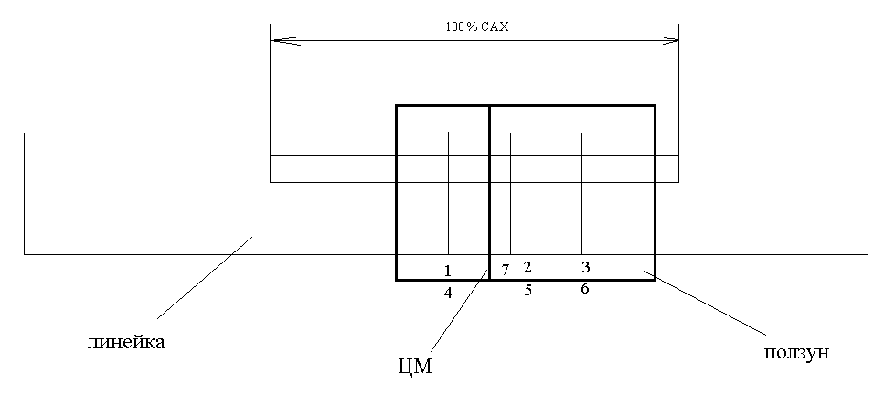 Но для этого необходимо знать центр масс самолета относительно САХ. И зная центр тяжести (центр тяжести совпадает с центром масс, мне не ясно почему их в аэродинамике рассматривают как разные характеристики ЛХ ЛА, скорее всего, разница в определениях этих понятий не более чем жонглирование словами) самолета относительно САХ, и расстояние то ЦТ до центра тяжести каждого бака легко определит и значение числа «d». Но как определить расстояние центров масс баков и плоскости центра масс самолета. Для этого предлагаю снабдить каждый экипаж линейкой, изображенной на рисунке.