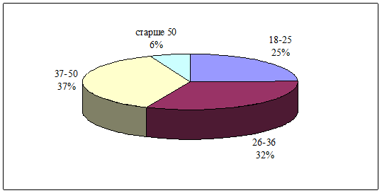 В организации работают в основном молодые специалисты. Основной возраст персонала предприятия 37-50 лет (37 % или 30 человек), 32 % сотрудников в возрасте от 26 до 36 лет, 25 % - в возрасте от 18 до 25 лет, и лишь 6 % персонала старше 50 лет (рисунок 3).