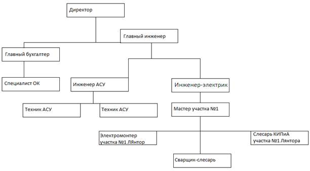 Организационная структура - это внутренняя упорядоченность, согласованность и взаимодействие отдельных частей единого целого. Основной для образования структурных (составных) частей организации является предназначение самой организации и функции, которые выполняют ее составные элементы. Существуют следующие основные виды организационных структур управления: линейная, функциональная, линейно-функциональная. Линейная структура характеризуется непосредственным воздействием руководителя на управляющее звено по всем функциям управления. Линейный руководитель единолично отвечает за работу подчинённых звеньев. Ему подчинены руководители и исполнители нижестоящих подразделений, а он подчинён вышестоящему начальнику. Достоинства и недостатки: Такая структура эффективна при небольших объемах работ численности работников. Но вместе с тем требует руководителей глубоких разносторонних знаний. Что при небольшом объеме производства и его сложности ограничивает использование такого принципа построения организационной структуры управления. При функциональной структуре общее руководство осуществляется линейным руководителем через руководителей функциональных органов. При этом руководители специализируются по отдельным управленческим функциям. Функциональный начальник наделён правами распорядительства. Линейно-функциональная структура управления это смешанная структура, объединяющая в себе элементы линейной и функциональной структур. Она состоит в том, что линейные руководители осуществляют свою деятельность на принципах единоначалия, но для обеспечения необходимой компетенции управленческих решений при руководителе создаются функциональные подразделения (отделы, группы), которые возглавляют ведущие специалисты в определённых областях. Они выступают в качестве помощников руководителя по отдельным функциям управления, готовят решения, но принимает их руководитель-единоначальник подразделения. Преимуществом этой структуры является повышение качества принимаемых решений и соблюдение принципа единоначалия, а недостатки состоят в тенденции к разбуханию штатов функциональных служб, и их отрыву от проблем, наиболее важных для исполнителей. ООО «ЭМА» - Электро-Монтаж и Автоматика занимается обеспечением надежной работы средств и систем комплексной автоматизации производственных процессов и предоставлением достоверной информации для управления производством. В своей деятельности предприятие руководствуется: ООО «ЭМА» обслуживает котельные г.п. Лянтора, п. Нижнесортымский (ДЕ 25, ДЕ 16, КВГМ 50), ЦТП (центральные тепловые пункты), КНС (канализационная насосная станция), ДНС, водозабор, очистные сооружения. Организационная структура ООО «ЭМА» является функциональной структурой управления. В организации ООО «ЭМА» работает 18 человек. Директор ООО «ЭМА» организует работу и эффективное взаимодействие подразделений, обеспечивает выполнение работ по внедрению новой техники и технологии. Он организует разработку организационно-технических мероприятий, направленных на повышение эффективности производства и улучшения условий труда, составление программы капитального ремонта и реконструкции средств автоматизации. Специалист отдела кадров подчиняется экономисту, его работа заключается в ведение ка