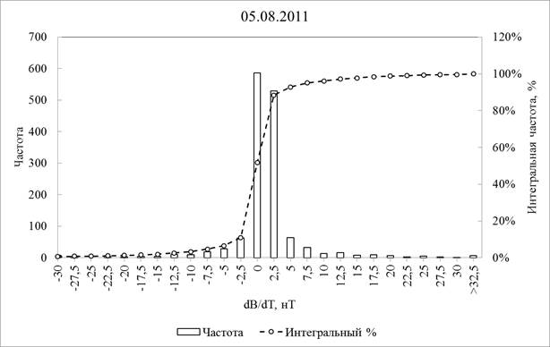 Рассмотрим более подробно два магнитовозмущенных периода из наблюдавшихся на фазе роста 24-го цикла солнечной активности для получения вероятностных характеристик нахождения скорости изменения магнитного поля на определенном уровне. Частота превышения dB/dT различных уровней во время магнитной бури 05-07.08.2011 показана на Рис.5.