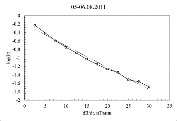 Уровень магнитного возмущения 05.08 17 – 20 часов достигал G4(Kp=8), 20 – 23 G3, при переходе на 06.08 23 – 02 G2, 02 – 05 G1 и далее интенсивность бури равномерно спадала до 08: 00 07.08.2011. За все сутки 05.08.2011 времени интервалы со скоростью изменения магнитного поля > 5нТ составляли 7, 15%, > 20нТ 1, 18%, > 30нТ 0, 42% и < -5нТ6, 6%, < -20нТ 1, 32%, < -30нТ 0, 56%. Вероятность превышения уровня (Р) в зависимости от величины скорости изменения магнитного поля показана на Рис. 6 и может быть записана выражением log(P) = -0, 0517(dB/dt) - 0, 1946 при R² = 0, 9874.