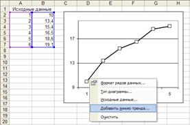 2.1 Построение нелинейной регрессии с использованием команды «Добавить линию тренда» Цель работы. Используя пространственную выборку таблицы 2.1 необходимо построить уравнение нелинейной регрессии вида Команда «Добавить линию тренда». Используется для выделения тренда (медленных изменений) при анализе временных рядов. Однако эту команду можно использовать и для построения уравнения нелинейной регрессии, рассматривая в качестве времени Эта команда позволяет построить следующие уравнения регрессии: · линейную · полиноминальную · логарифмическую · степенную · экспоненциальную Для построения одной из перечисленных регрессий необходимо выполнить следующие шаги: Шаг 1. В выбранном листе Excel ввести по столбцам исходные данные Шаг 2. По этим данным построить график в декартовый системе координат (см. рис 2.1). Шаг 3. Установить курсор на построенном графике, сделать щелчок правой кнопкой и в появившемся контекстном меню выполнить команду Добавить линию тренда (см. рис. 2.1). Шаг 4. В появившемся диалоговом окне (см. рис. 2.2) активизировать закладку «Тип» и выбрать нужное уравнение регрессии.