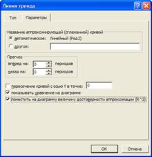 Рис. 2.3. Задание опций вывода информации · «Поместить на диаграмму величину достоверности аппроксимации (R^2)» - на диаграмме будет показано значение коэффициент детерминации где Если по построенному уравнению регрессии необходимо выполнить прогноз, то нужно указать число периодов прогноза (см. рис. 2.3). Назначение других опций понятны из своих названий. Шаг 6. После задания всех перечисленных опций щелкнуть на кнопке «OK» и на диаграмме появиться формула построенного уравнения регрессии и значение индекса детерминации