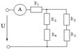 $$$ 239 Определить показание амперметра, если U= 10 B, R1=7 Ом, R2 = 8Ом, R4=4 Ом, R3 = R5 = 2 Ом.