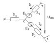 A) 12A $$$ 29 Берілген: I1 = 3A, I2 = 2, 4A, E1 = 70 B, E2 = 20 B, R1= 8Ом, R2=5 Ом. Uаб анық таң ыз.