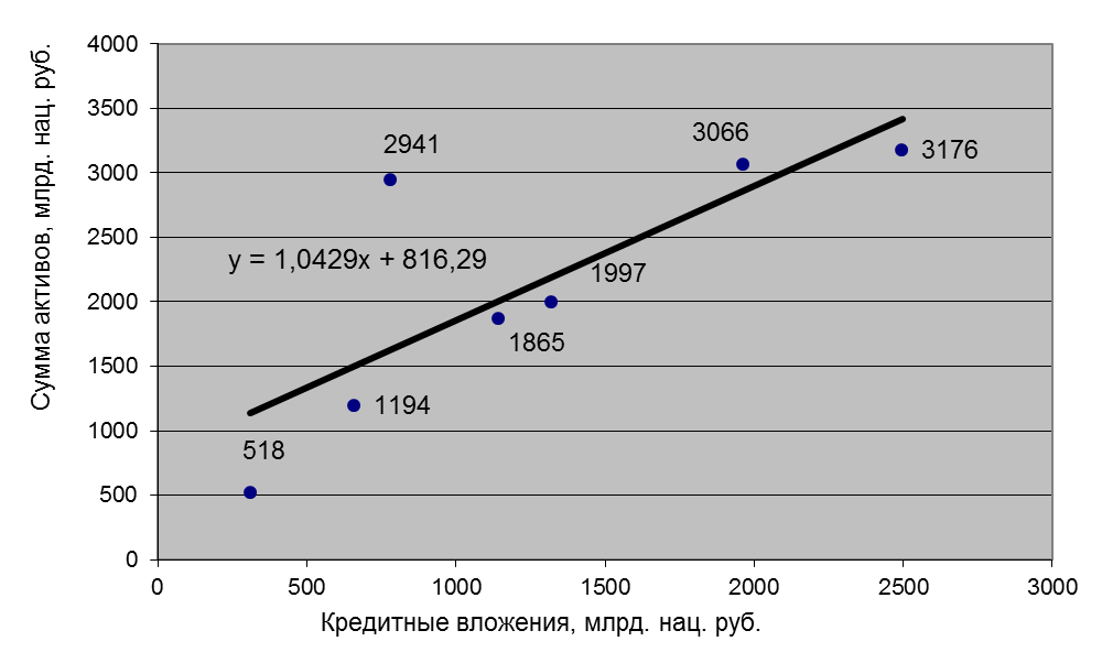 Рисунок 2 - Зависимость суммы активов банка от кредитных вложений