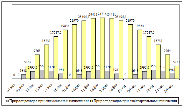График 2.2.2. Изменение доходов по сложным процентам в зависимости от календарной даты ссуды. Вторым фактором, второй составляющей эффекта «сложных процентов» был назван фактор календарной даты оказания ссуды. На следующей диаграмме (График 2.2.2) представлена динамика изменения доходности кредитования под сложные проценты с изменением даты совершения сделки. Приведены данные по ссуде с прежними условиями, то есть в 1 000 000 грн. сроком на 1 год под 60%, годовых. По диаграмме дополнительный доход нарастает по мере увеличения разрыва в датах начисления и датах оказания кредита, достигает пика в момент, когда дата выдачи кредита равноудалена от предыдущей и последующей даты начисления (разрыв достигает максимального размера) и в дальнейшем с той же закономерностью, с точностью до рубля, снижается. Поэтому, оценивая дополнительный доход вследствие несовпадения дат начисления процентов и оказания кредита, важно знать не столько абсолютную величину разрыва в указанных датах, сколько их соотношение, степень их разрыва. Характерно, что представленные расчеты сделаны для ежемесячного и ежеквартального начислений, проводимых на 1 число месяца. Те же данные точно соответствуют расчетам по ссуде, оказанной 1 числа, с датой начисления процентов на 1-е, 6-е, 11-е и т.д. числа месяца. В оценке рассматриваемого дополнительного дохода принципиальна не только величина разрыва в датах начисления и совершения займа. Максимальный разрыв в датах для ежемесячных и ежеквартальных начислений дает совершенно различный эффект. Пик разрыва для месяца дает 3 566 грн. для квартала – 24 716грн., то есть почти в 7 раз больше. Это означает, что степень влияния фактора также зависит от длительности периода начисления. Чем больше период начисления, тем больше влияние рассматриваемого фактора. Если банк использует сложные проценты и ведет их начисление в общеустановленные дни, в оплате ссуд всегда присутствуют дополнительные доходы для него и дополнительные расходы для заемщика. Но практически в активных операциях банки, за исключением условий оплаты просроченной задолженности, используют простые проценты, в которых отсутствует этот элемент дополнительного дохода. Таким образом складывается положение, когда банки не имеют дополнительных доходов выступая в роли кредиторов. Рассмотрев сравнительную оценку двух разных способов начисления процентов - простых и сложных – мы выявили их особенности и специфику. Теперь важно оценить полученные результаты. Анализ соотношения уровня доходности простых и сложных процентов показывает безусловные преимущества второго метода для кредитора и его заведуемую убыточность для заемщика, и наоборот. Однако, результаты тех же исследований показали, что отличительным качеством начислений по простым процентам является регулярность поступлений дохода, равно как разовый характер поступлений, отсроченных до момента гашения займа, определяет специфику начислений по сложным процентам. Учет соотношения стоимости разновременных платежей в измерениях доходности финансовых операций более, чем принципиален. Это особенно важно в условиях постоянного роста цен и обесценения денег. В целом итоги рассмотрения двух систем процентных ставок помогают преодолеть некоторые стереотипы в восприятии простых и сложных процентов. Традицион